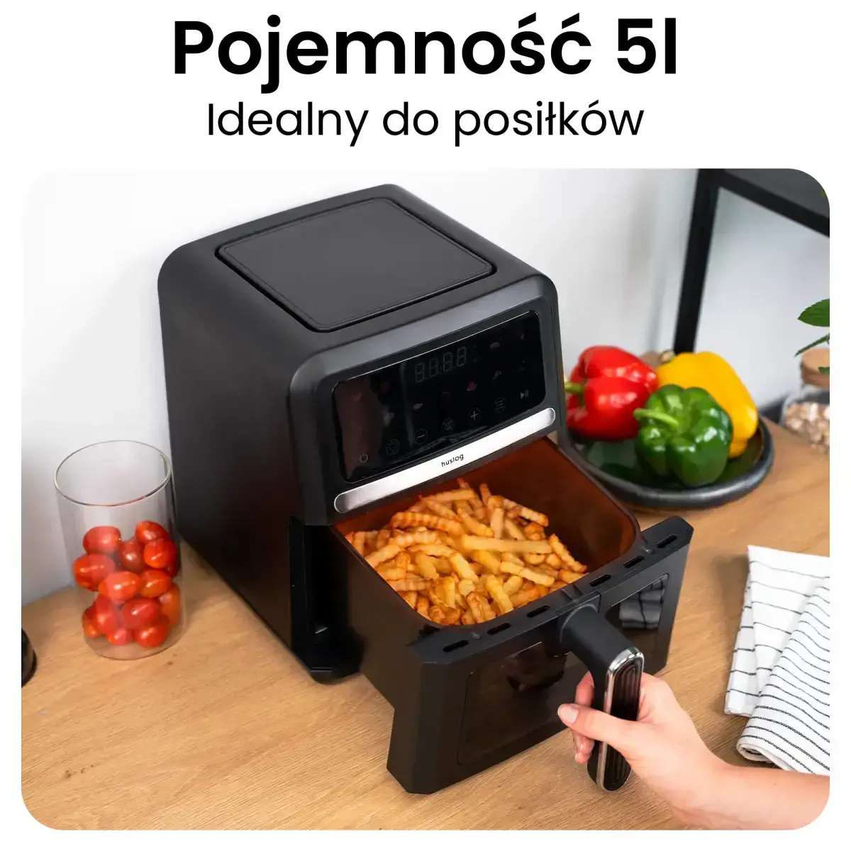 The Huslog HUS1032 Airfryer is a modern, fat-free fryer that allows you to prepare healthy and delicious meals for the whole family. Equipped with 10 automatic programs, it enables quick preparation of fries, meats, fish, pizza, bread, cakes, and even drying fruits and mushrooms. The spacious 5L basket and rack ensure ease of cooking larger portions.