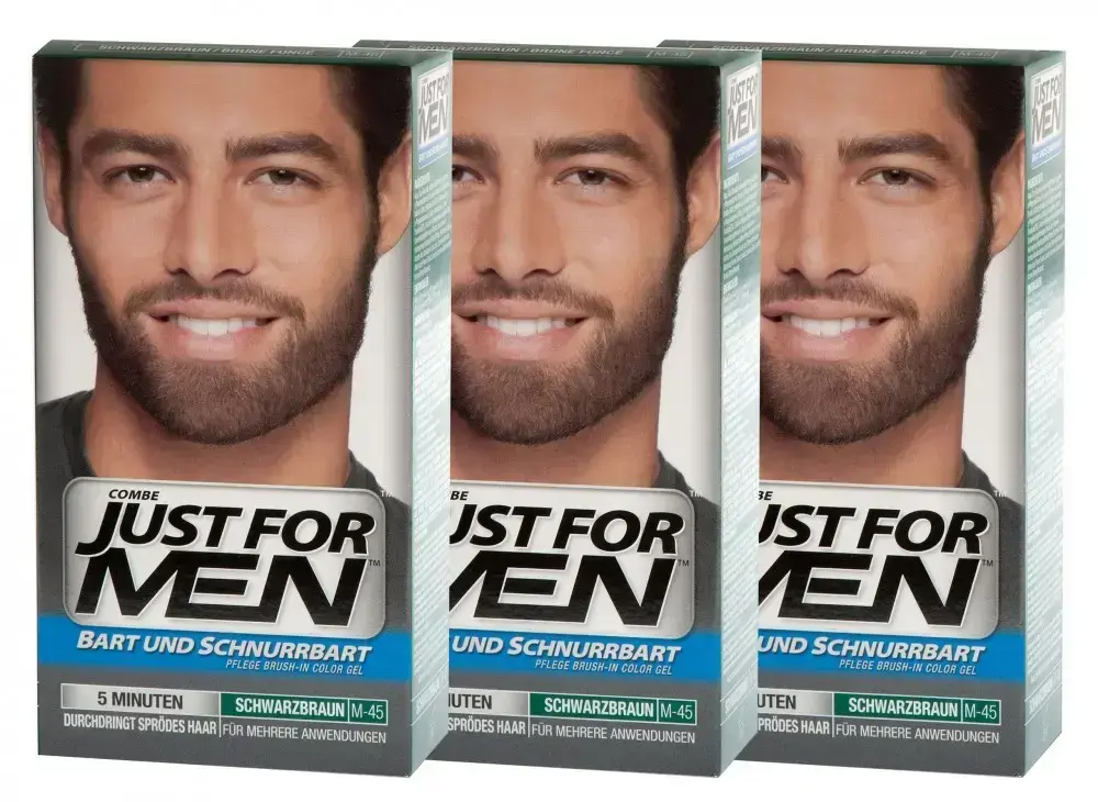 Just For Men Moustache & Beard Brush - In Colour - Dark Brown/Black penetrates coarse facial hair. Lasts until the grey grows back. Each shade matches the same Just for Men head haircolour. Plus, you get multiple applications from one box. | Just For Men Brush-In Facial Hair Colour - Dark Brown-Black In Clear.