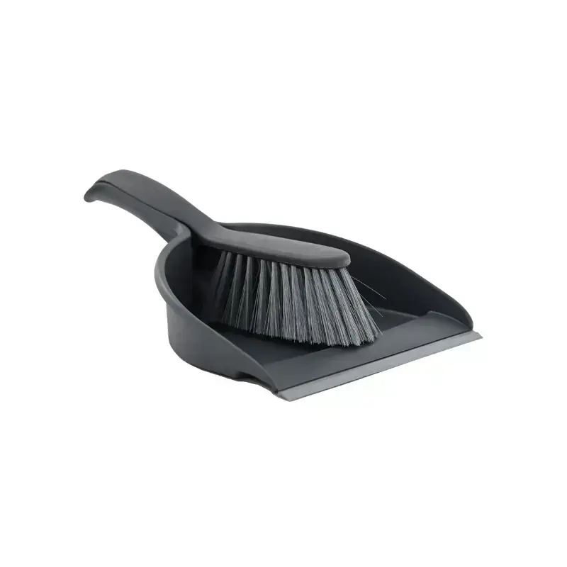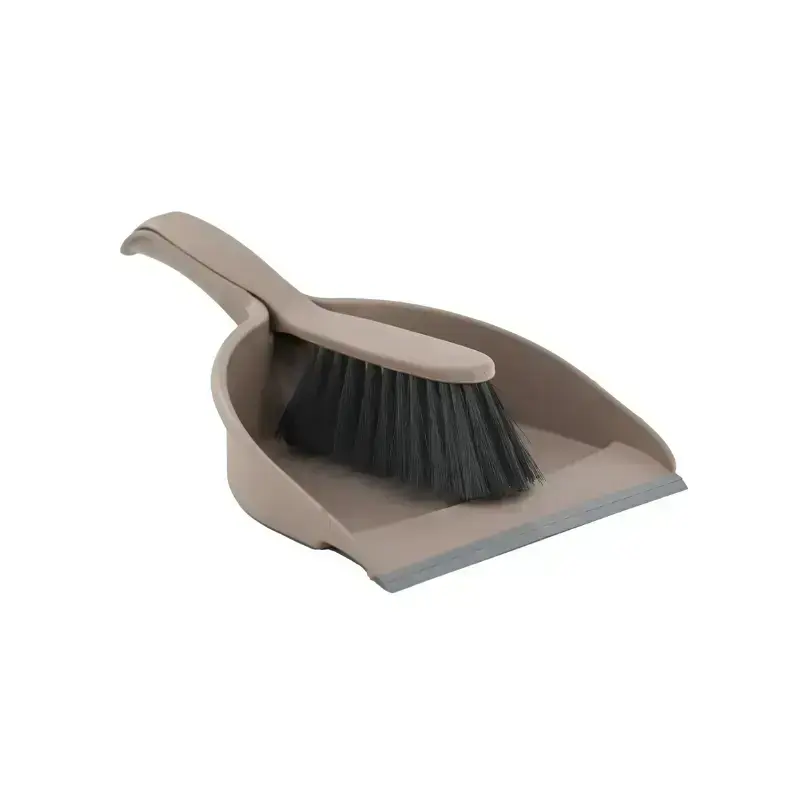 Praktisks grīdas slaucīšanas komplekts: birste un liekšķere ar gumijas uzgali, kas labi pielīp pie virsmas, novēršot netīrumu izplatīšanos uz sāniem.