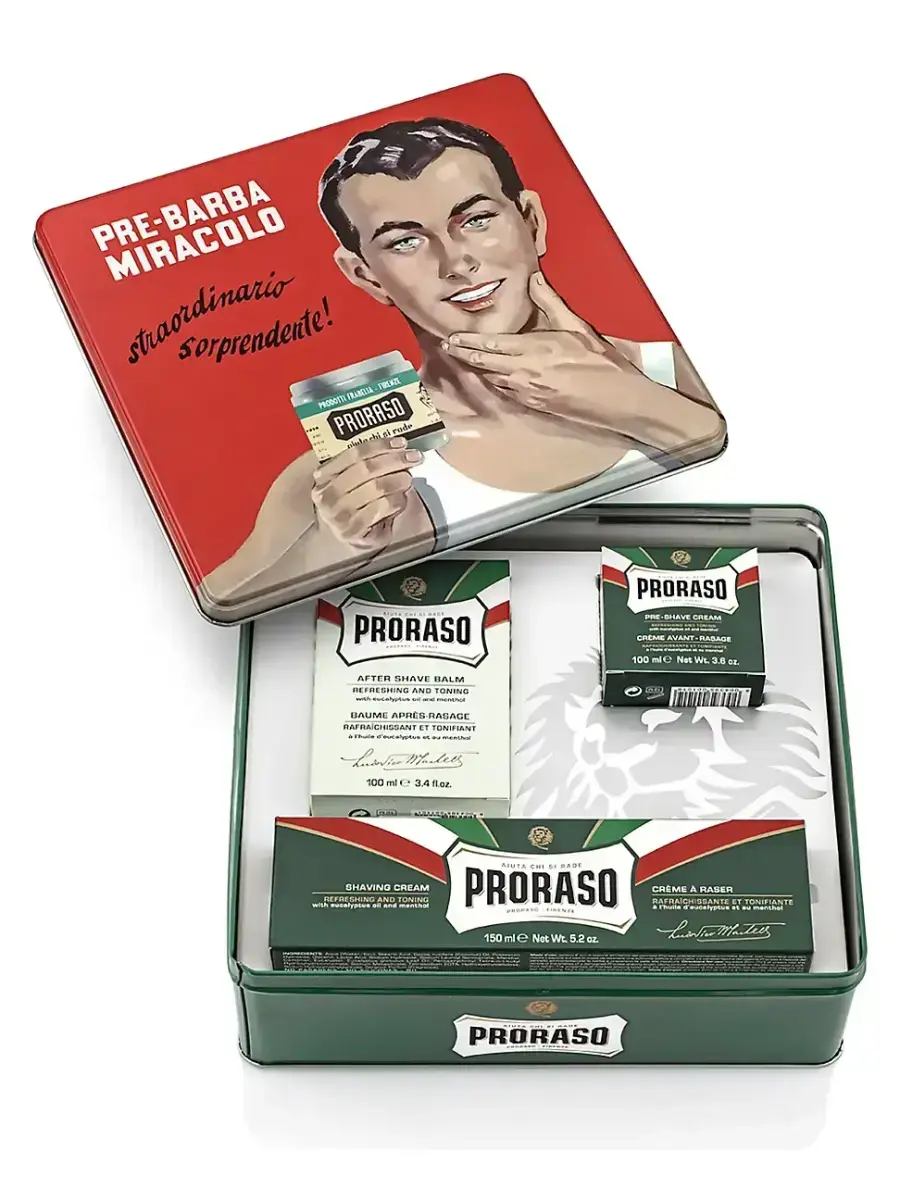 Immerse yourself in the timeless elegance of Proraso with this classic shaving kit featuring three full-size products from their iconic green line renowned for its refreshing eucalyptus and menthol fragrance. Since 1908 Proraso has been at the forefront of the shaving world crafting grooming essentials that stand the test of time. With a nod to their rich history and 50s marketing charm Proraso presents the Vintage Gino Tin: Refresh Shaving Kit packaged in a vintage collectible tin adorned with the iconic image of Gino the brand s beloved spokesman since the 1950s.This comprehensive kit includes three essential Proraso products to elevate your shaving experience. Begin with the Proraso Pre and amp; Post Shave Cream a versatile formulation that softens and preps your beard before shaving while doubling as a moisturizing aftershave offering a classic menthol and eucalyptus scent with each application. Follow up with the Proraso Shaving Cream a perennial favorite among wet shavers renowned for its cleansing eucalyptus and toning menthol delivering a close and comfortable shave every time. Complete your grooming routine with the Proraso Alcohol-Free After Shave Balm a soothing and hydrating post-shave solution infused with eucalyptus oil and menthol to tone and revitalize your skin without the stinging burn of alcohol-based splashes. Experience the quality and heritage of Proraso with this vintage-inspired shaving kit that captures the essence of traditional Italian grooming rituals.Made in Italy.