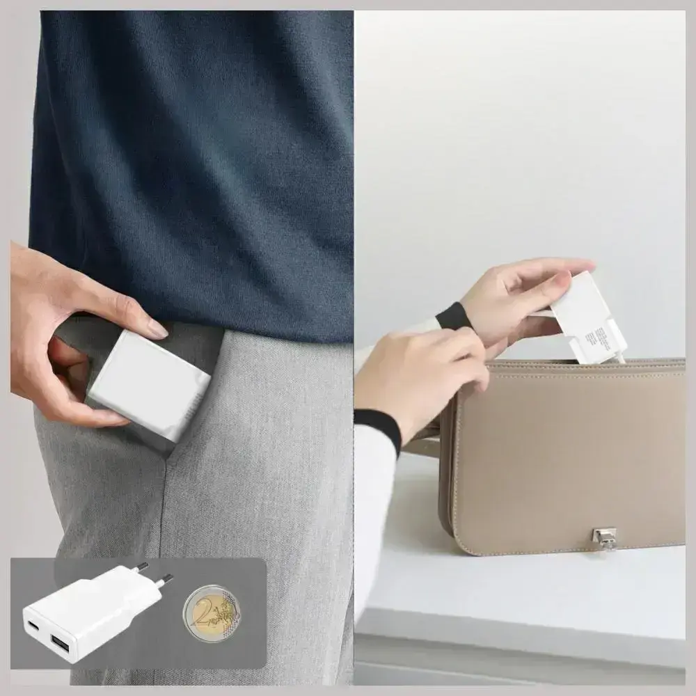 The charger is equipped with two ports – a USB-C supporting Power Delivery up to 20 W and a USB-A with fast charging function. This allows two devices to be powered simultaneously without loss of performance. Smartphones compatible with PD technology can be charged from 0 to 50% in about 30 minutes, making it an ideal accessory both at home and on the go.