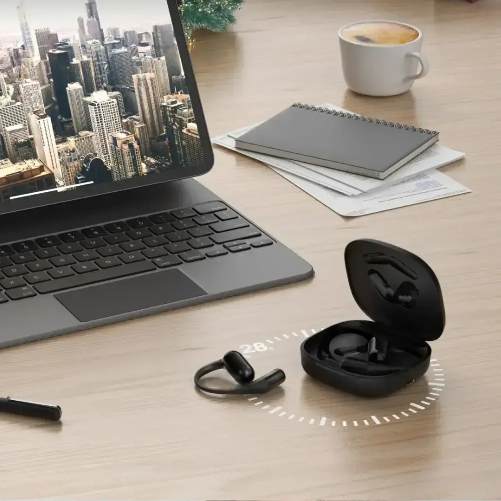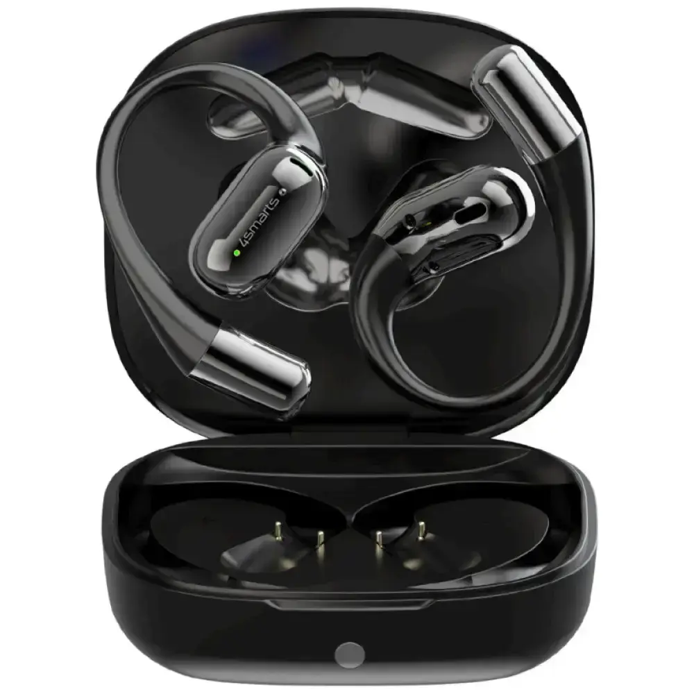4smarts SkyBuds OWS Bluetooth headphones combine modern design with advanced technology. Thanks to Bluetooth 5.4, they provide stable and fast connection within a range of up to 10 meters. Their open-ear design guarantees safety and awareness of the surroundings without compromising sound quality. The integrated touch screen on the case allows control of up to 13 functions without needing to reach for your phone. Compact size, lightweight construction (only 80 g), and battery life up to 28 hours with the case make SkyBuds an ideal solution for work, travel, and everyday use.