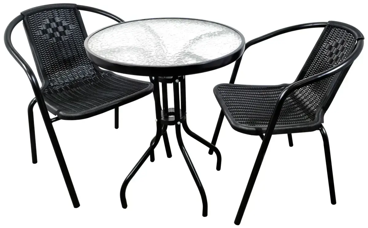 Dārza mēbeļu komplekts no 3 daļām melnā krāsā. Komplektā ietilpst 2 krēsli un 1 galds. Galdam ir apaļas formas stikla virsma un krāsots metāla rāmis. Krēsli ar roku balstiem un krāsotu metāla rāmi, to sēdvieta izgatavota no pītas mākslīgās rotangas.