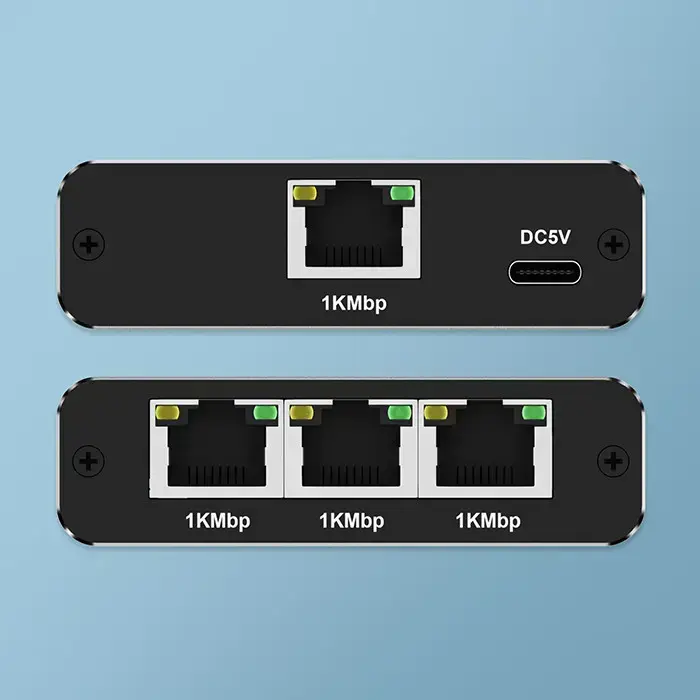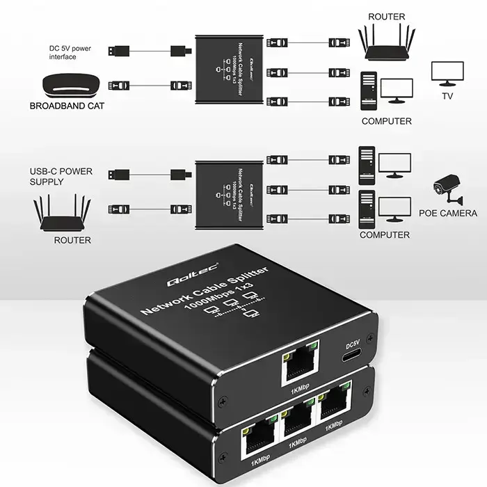 The Qoltec splitter splitter allows you to split the signal from a single network cable into three RJ45 outputs, maintaining full data transmission speeds of up to 1000 Mb/s. Power supply from the USB port provides additional stability of the connection over a distance of up to 100m. Aluminum housing, gold-plated connectors and reinforced PCB board. No additional software installation required, just connect the network cable.