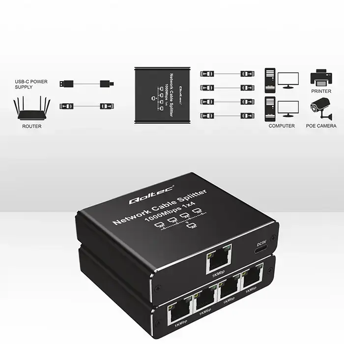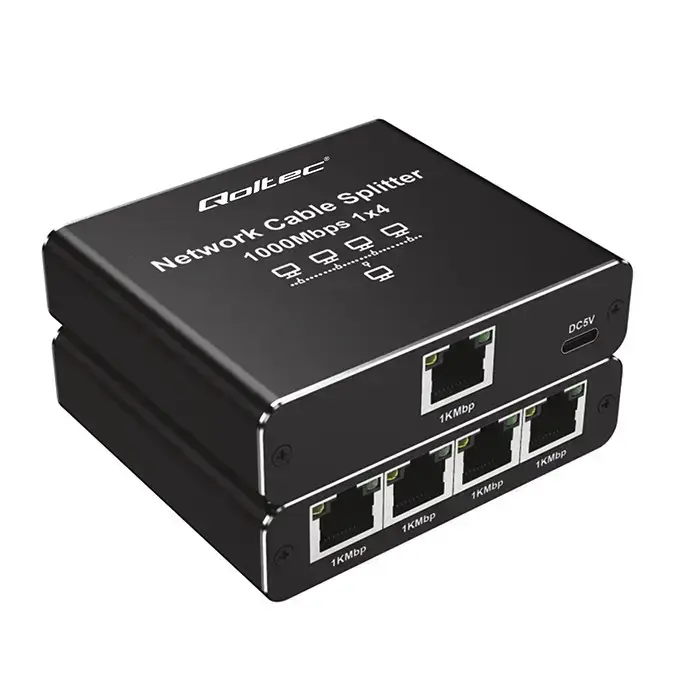 The Qoltec splitter allows you to split the signal from a single network cable into four RJ45 outputs, maintaining full data transfer speeds of up to 1000 Mbps. Power supply from the USB port provides additional connection stability at distances of up to 100 metres. Aluminium housing, gold-plated connectors and reinforced PCB. No additional software installation required, just connect the network cable.