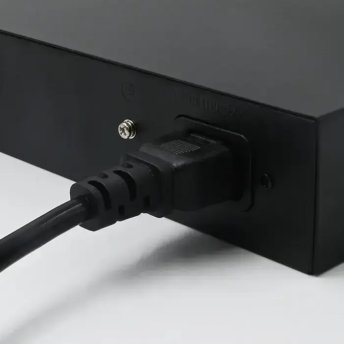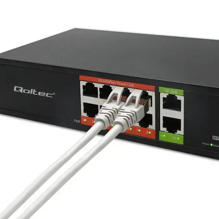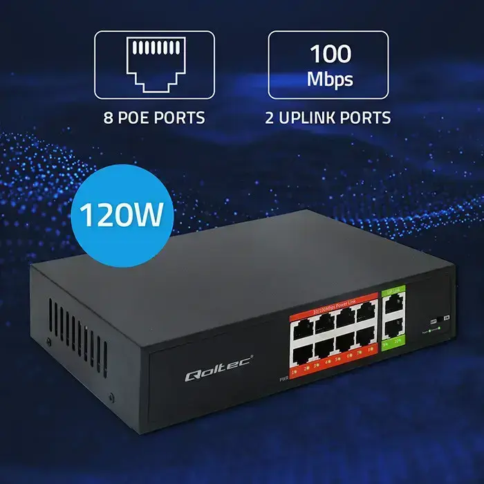 The SWITCH PoE network switch combines switch functions with the ability to power network devices via Ethernet. It is equipped with 8 100Mb/s ports with PoE power support and an additional 2 100Mb/s uplink ports. It enables data transmission and power supply to IEEE 802.3af-compliant devices, such as IP cameras and Wi-Fi access points, offering a maximum power of 15.4W per port and a total maximum power of 120W for the entire device. It automatically detects and identifies connected devices, ensuring safe and optimal power supply. Power cable included.