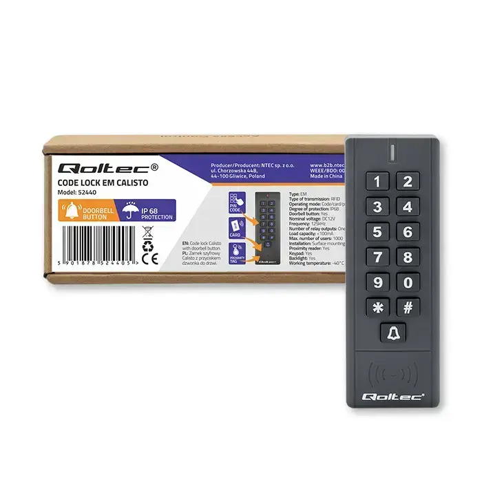 Qoltec Code lock CALISTO with RFID reader | Code | Card | key fob | Doorbell button | IP68 | EM