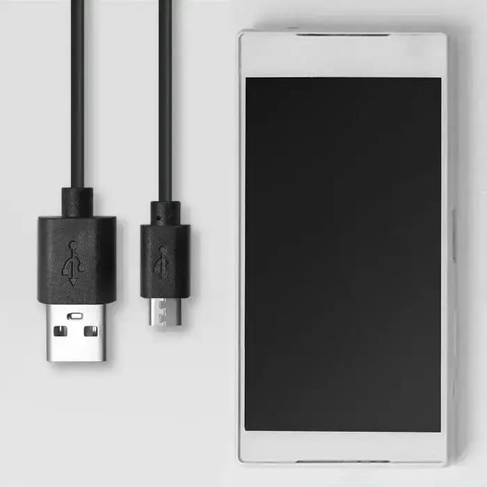 A micro USB/USB-A charging cable that is commonly used to connect various electronic devices such as smartphones, tablets, cameras, or some models of headphones and other accessories. The micro USB cable consists of two main parts: a micro USB plug and a USB-A connector.