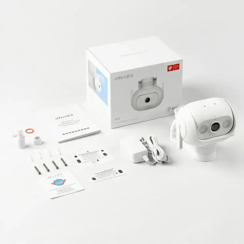 Camera, power adapter, manual, mounting template, screw set, warranty extension card