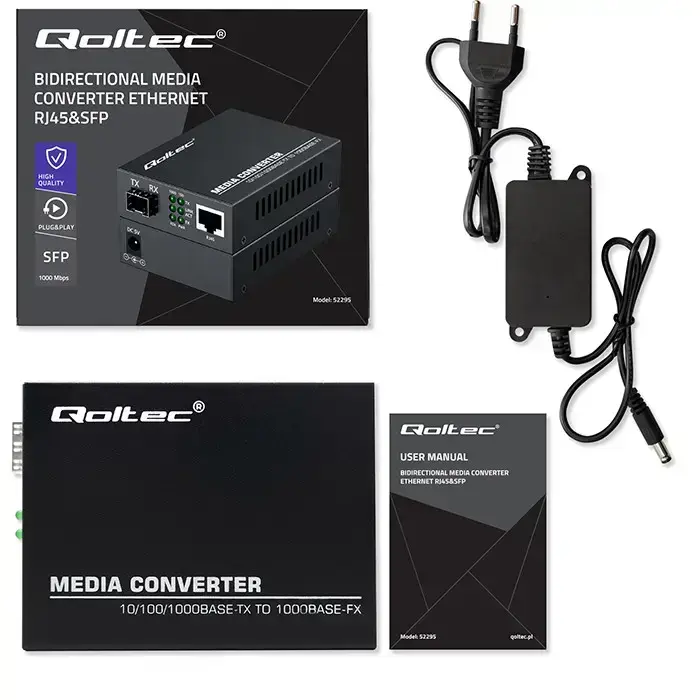 Qoltec Bidirectional Ethernet SWITCH Media Converter 1x RJ45 1x SFP| 1000Mbps | 5V