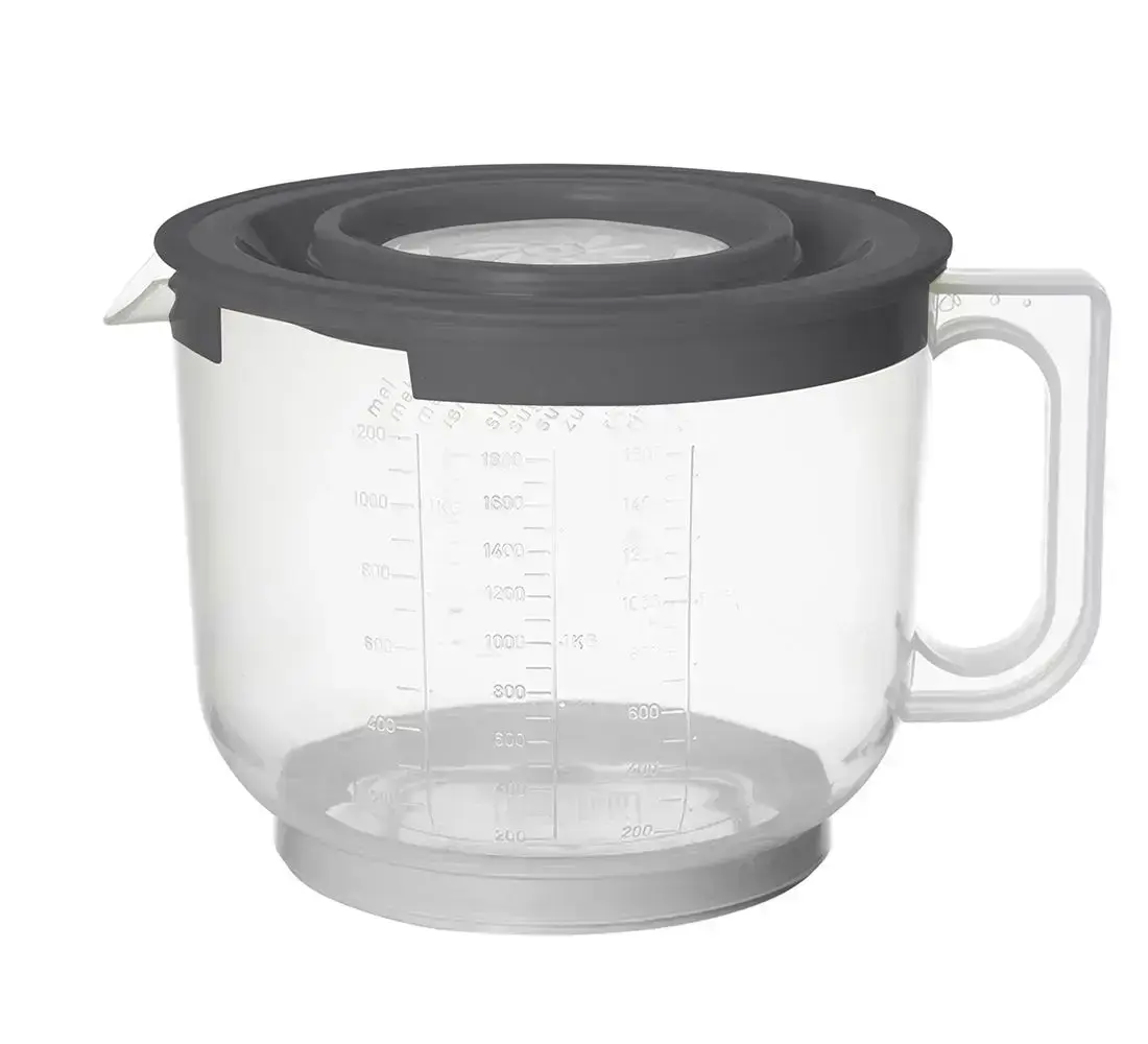 Miksera trauks ar pelēku vāku ļauj izmērīt, samaisīt un uzglabāt – viss vienā piegājienā. Vāks nodrošina, ka saturs paliek traukā bez izšļakstīšanās, un gumijas mala apakšā nodrošina, ka trauks stabili turas uz galda maisīšanas laikā. Tam ir mērskala abās pusēs, kā arī snīpis vieglai satura izliešanai. Produkts ir pārstrādājams, un to var ievietot cietās plastmasas atkritumu tvertnēs. Tas ir izgatavots no PP (polipropēna). Tilpums 2 l.