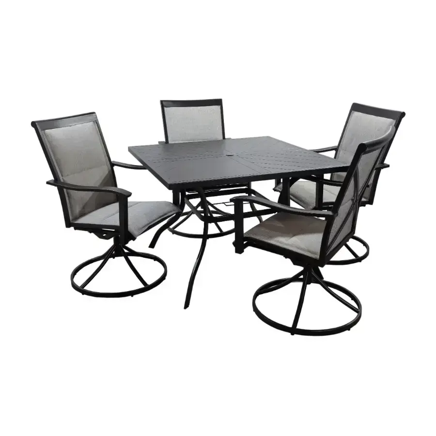 Besk dārza komplekts ar galdu un četriem krēsliem ir elegants un ērts risinājums terasei vai dārzam vidējām ģimenēm. Komplektā ietilpst stabils kvadrātveida galds ar dekoratīvu metāla virsmu un četri rotējoši krēsli ar roku balstiem, kas aprīkoti ar elpojošu tekstila sēdvietu un atzveltni. Krēslu rotācijas funkcija ļauj ērti pagriezties jebkurā virzienā, neceļoties no vietas, kas padara sarunas un atpūtu vēl komfortablāku. Masīvā metāla konstrukcija ar plastmasas elementiem nodrošina stabilitāti un ilgu kalpošanas laiku, savukārt neitrālā pelēkā krāsu gamma viegli iekļaujas jebkurā dārza dizainā. Galdam ir centrālais atvērums saulessarga uzstādīšanai, kas padara komplektu praktisku lietošanai jebkurā diennakts laikā.