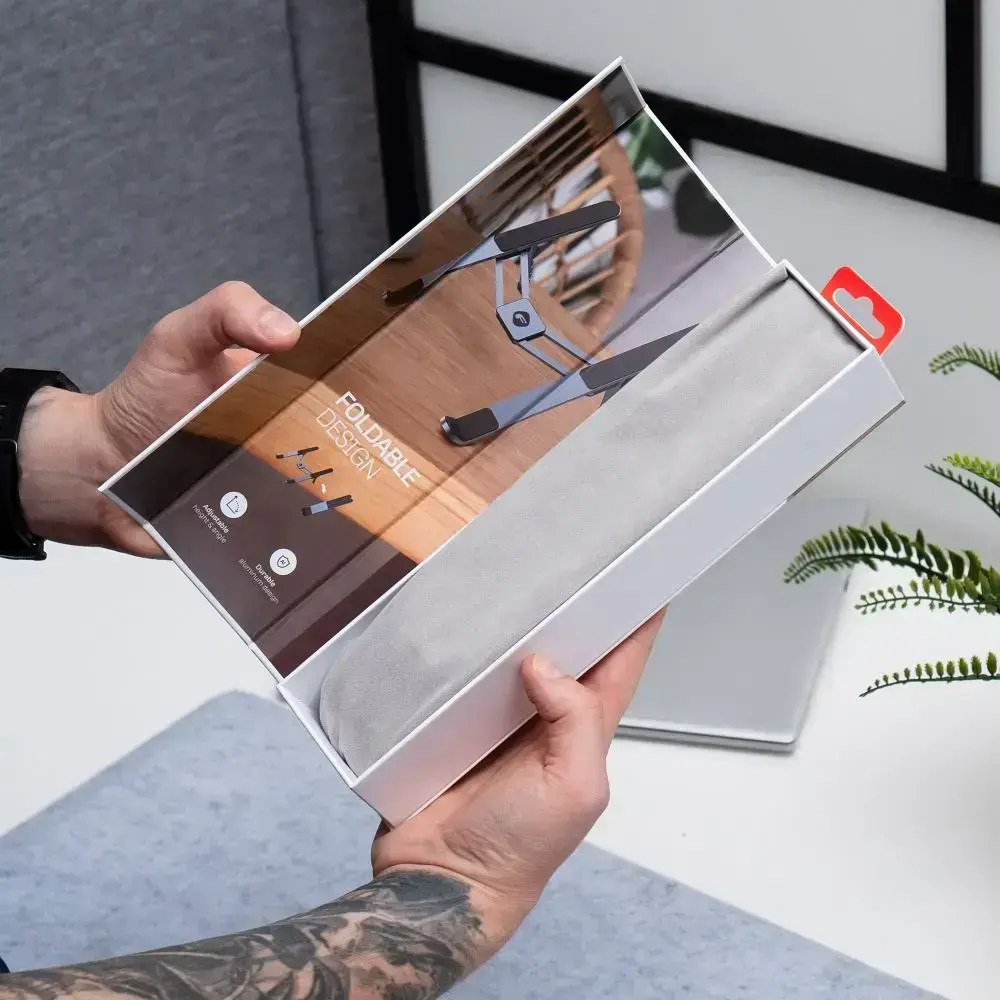 The stand is made from high-quality materials: aluminum, POM, and anti-slip silicone. This combination ensures rigidity and prevents the device from slipping or getting scratched. With a load capacity of up to 1.2 kg, it can securely support most popular laptop models or larger tablets.