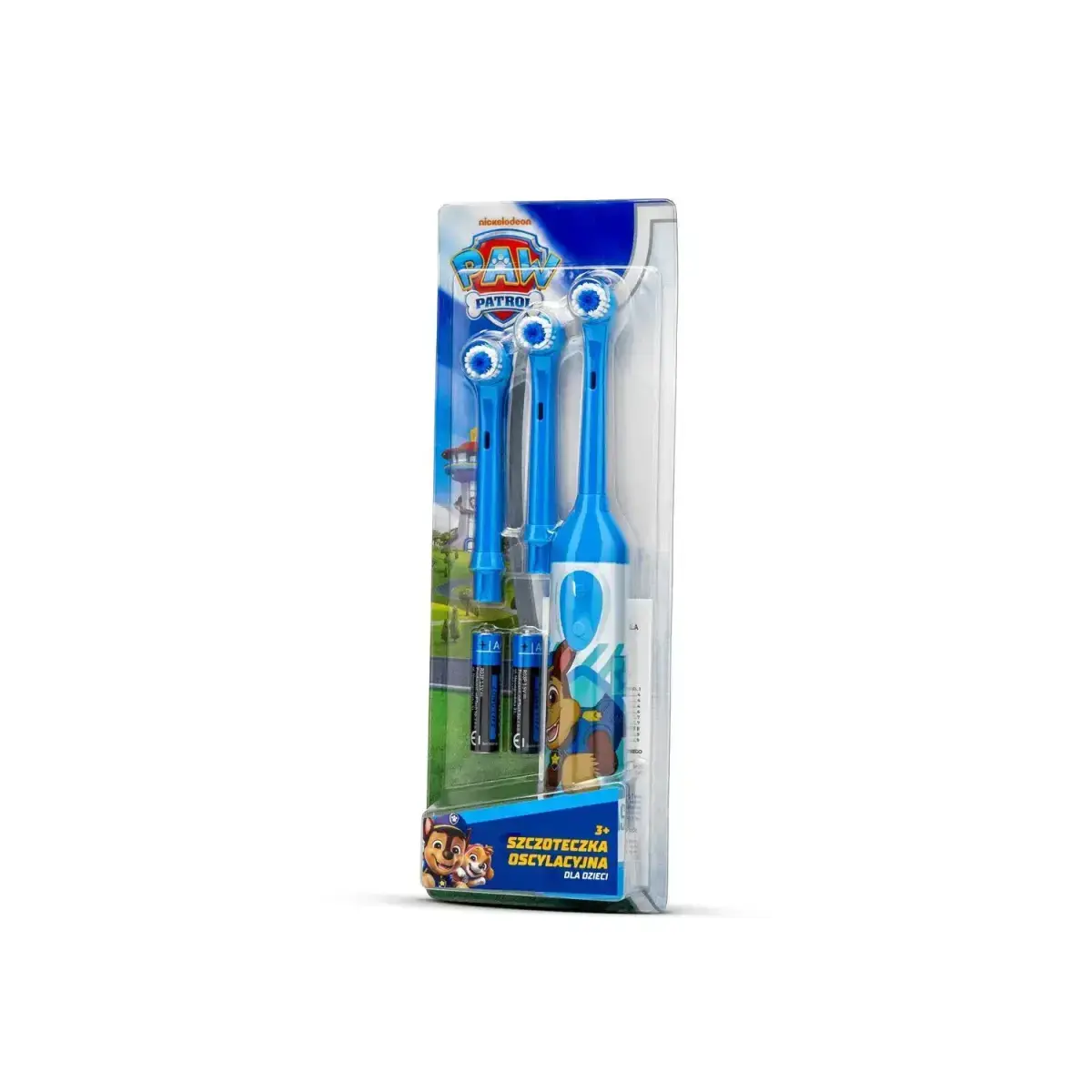 Children's oscillating toothbrush with Paw Patrol (Chase) theme, designed for daily oral hygiene. The oscillating movements help remove plaque and reach difficult areas, while the soft bristles support brushing comfort. The IPX4 rated casing is splash-resistant. Simple one-button operation and ergonomic shape make it easy for independent use.