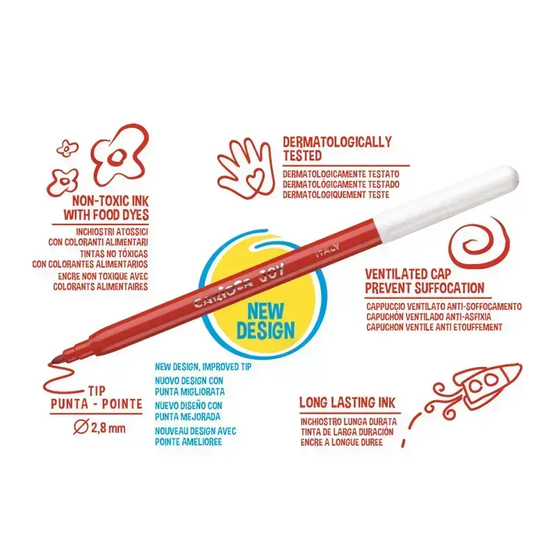 Serdeņa platums – 2 mm Raksta garums – 800 m Trecienizturīgs flomastera gals Tinte uz ūdens bāzes, viegli izmazgājama Kartona iepakojums 36 krāsu komplekts