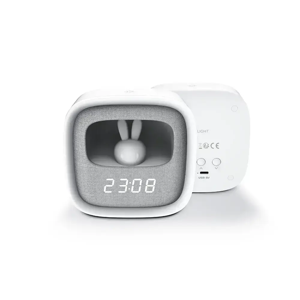 A bedside alarm clock with a night light is a functional device that combines several practical solutions, ideal for a child's room, a teenager, or an adult. The built-in rabbit figurine serves not only as a charming decoration but also as a night light that gently illuminates the room, creating a pleasant atmosphere.