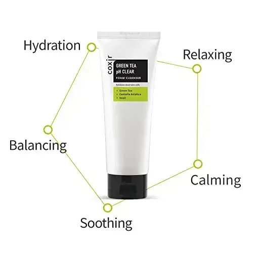Green tea pH clear foam cleanser formulated with green tea, centella and snail removes makeup and impurities while protecting the skin's moisture barrier.