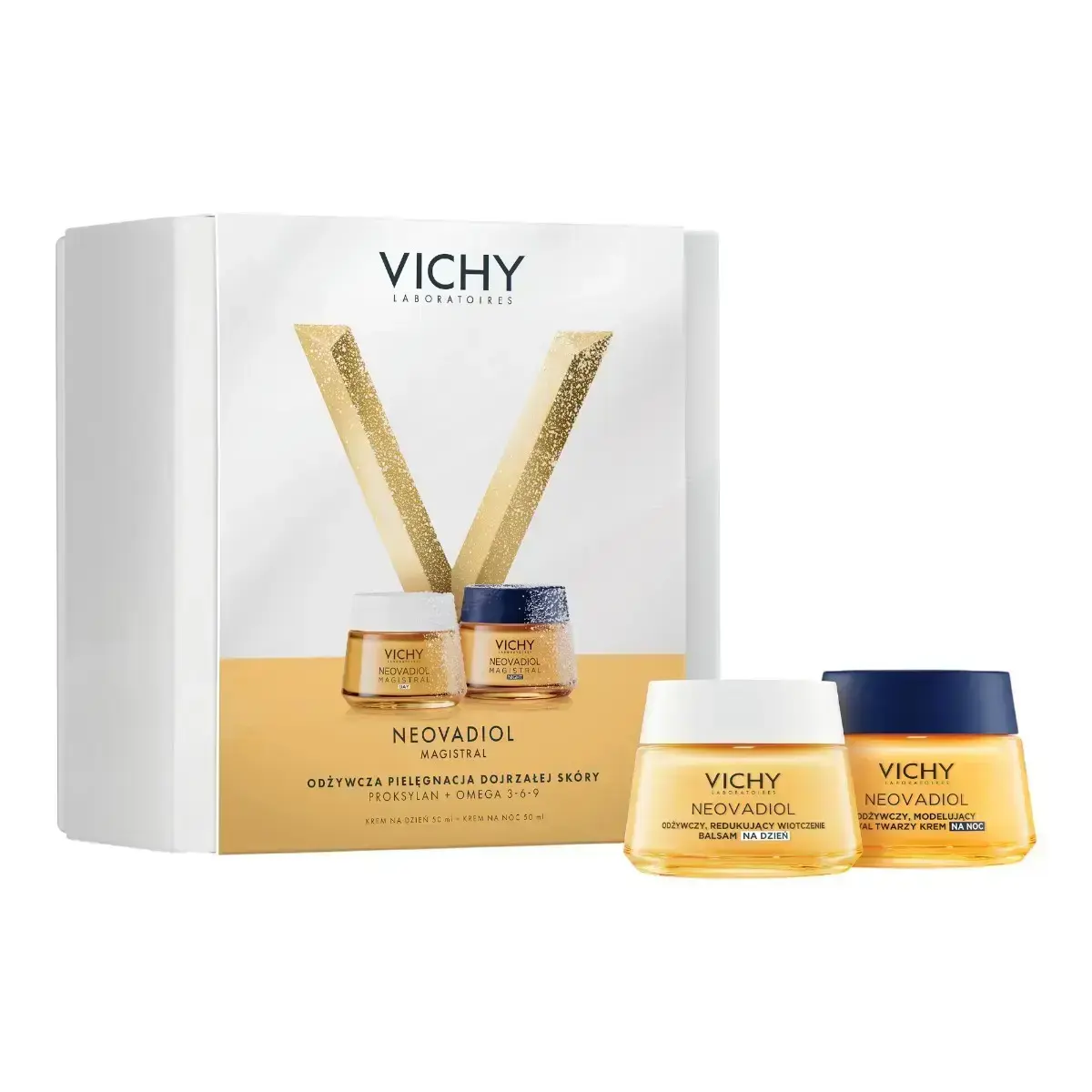 Das Vichy Neovadiol Magistral-Set enthält: 1. Vichy Neovadiol Magistral, nährender, schlaffer Tagesbalsam, 50 ml. 2. Vichy Neovadiol Magistral, nährende, konturierende Nachtcreme, 50 ml. Das Vichy Neovadiol Magistral Weihnachtsset ist ein elegantes Geschenk, das nicht nur Wirksamkeit, sondern auch einen Hauch von Weihnachtszauber in die Pflege reifer Haut bringt. Dieses sorgfältig zusammengestellte Duo enthält zwei Cremes in Originalgröße – eine für Tag und eine für Nacht –, die der Haut über 50 helfen, ihre Ausstrahlung, Dichte und Festigkeit wiederzuerlangen. Reichhaltige Formeln, angereichert mit Proxylan, Cassia-Extrakt, Omega-3-6-9-Fettsäuren und Niacinamid, pflegen, befeuchten und glätten den Teint und helfen, die Zeichen der Hautalterung zu reduzieren. Dieses einzigartige Weihnachtsgeschenk verwandelt Ihre tägliche Hautpflege in einen Moment der Freude und des Trostes.