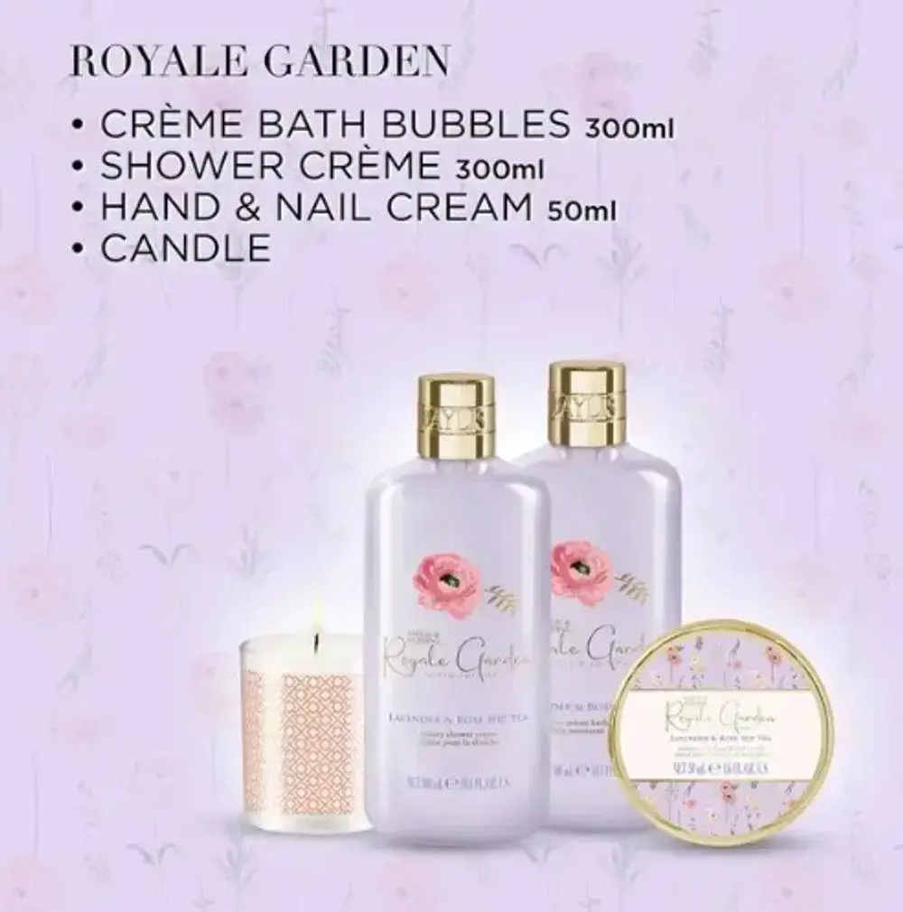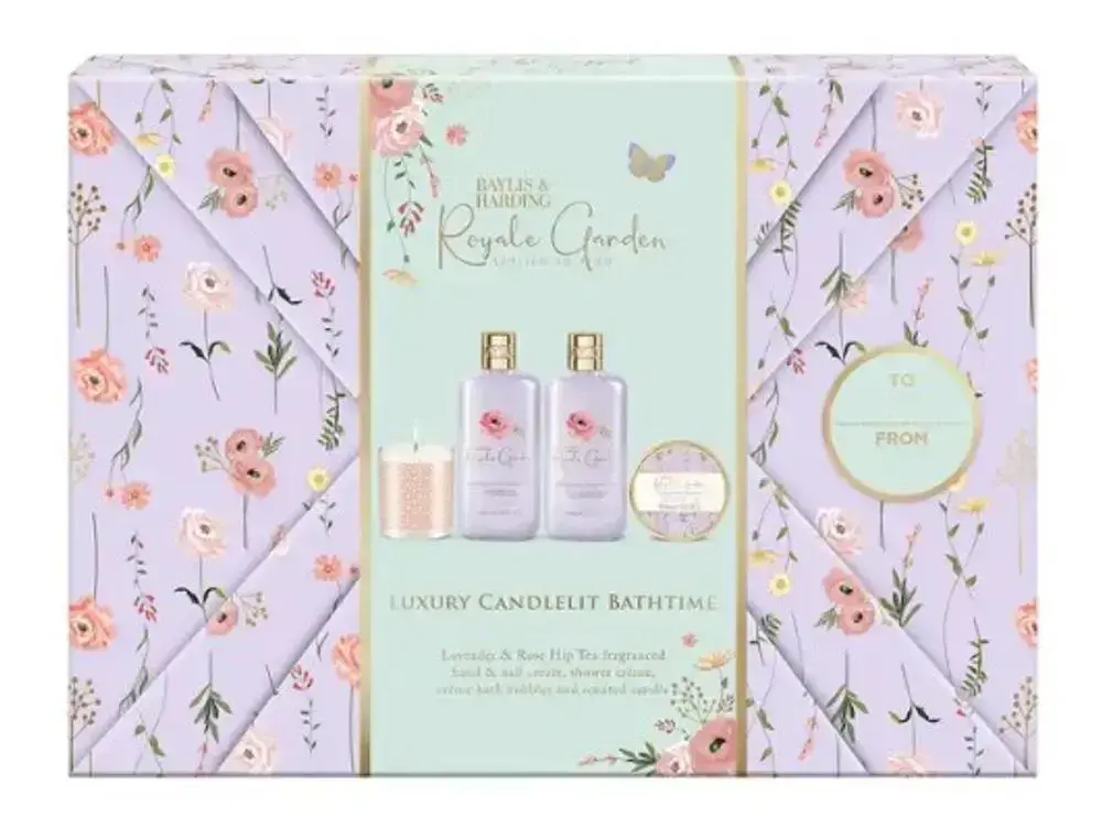 The Baylis & Harding Royale Garden Gift Wrapped Candlelit Gift Set is a delicately scented four-piece personal care collection, beautifully presented in a festive gift box. It includes a floral-scented 300ml creme bath bubbles, 300ml shower creme, a 50ml hand & nail cream, and a 60g scented candle. This gift set is designed to pamper your body, indulge your senses, and uplift your mood. It's a perfect present to place under your Christmas tree! What are the key features? Beautifully wrapped, ready-to-give gift set. Helps leave your skin beautifully fragranced with a floral scent. Included are a 300ml creme bath bubbles, a 300ml shower creme, a 50ml hand & nail cream, and a 60g scented candle. Quality assured, as it's made by Baylis & Harding, a reputable British brand known for their luxury bath and body care collections. Perfect as a pampering gift or self-indulgent treat for any occasion. | Baylis & Harding Royale Garden Gift Wrapped Candlelit Set in Clear.