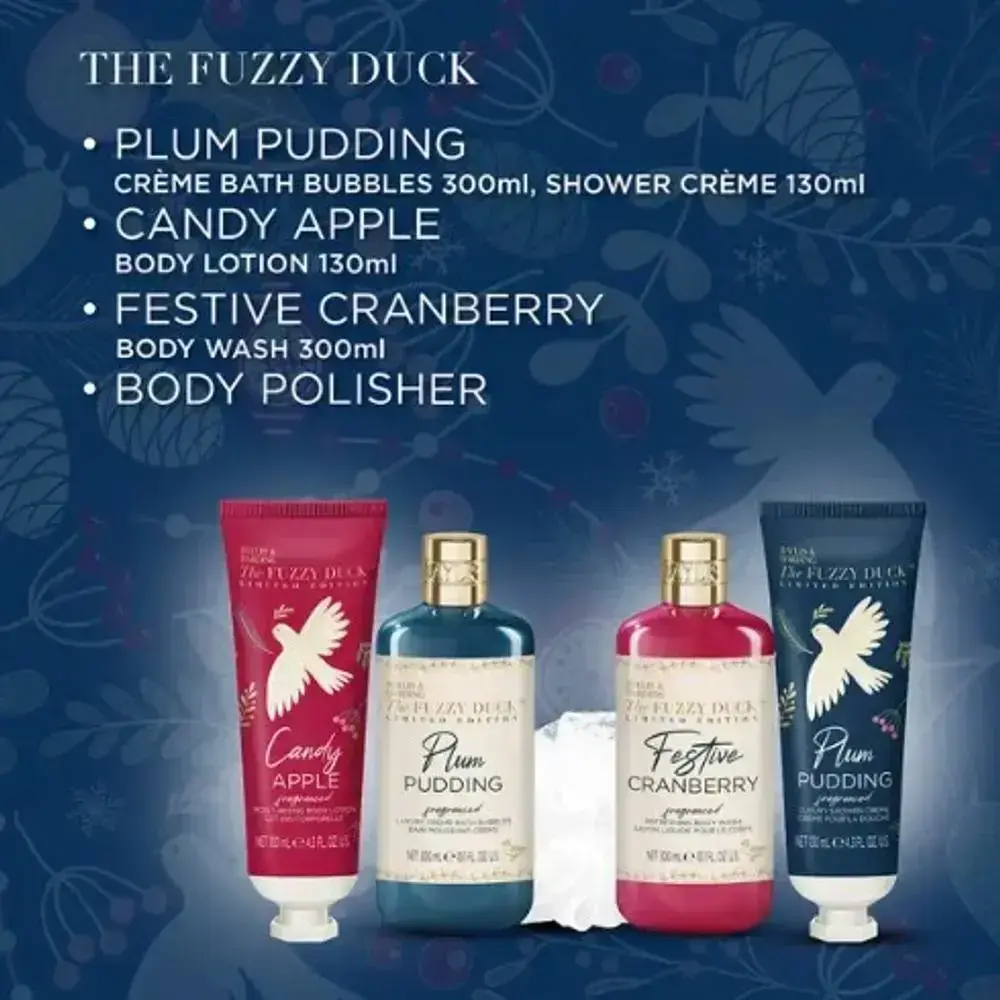 The Fuzzy Duck Winter Wonderland Gingerbread House Gift Set from Baylis & Harding consists of a selection of luxury bath and body products. It's beautifully packaged in a gingerbread house-shaped box, making it a perfect Christmas present. This set contains 300ml of body wash, 300ml creme bath bubbles, 130ml body lotion, 130ml shower cream and a body polisher. What are the key features? Body Wash and Shower Cream laden with comforting Christmas aromas. Crme Bath Bubbles for a luxurious, indulgent soak. Nourishing Body Lotion to keep skin soft and moisturised. Includes a Body Polisher for gentle exfoliation. Beautifully presented in a reusable gingerbread house-shaped box. | Baylis & Harding Winter Wonderland Gingerbread House Gift Set in Clear.