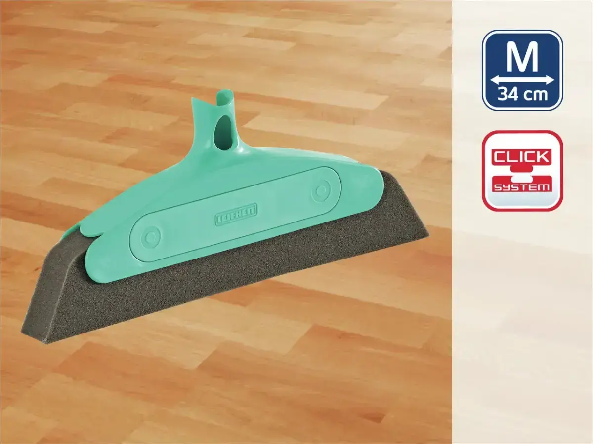 The LEIFHEIT Classic Foam Floor Brush has a width of 34 cm. It is compatible with the Click system handle (available in different lengths as well as telescopic handles).
