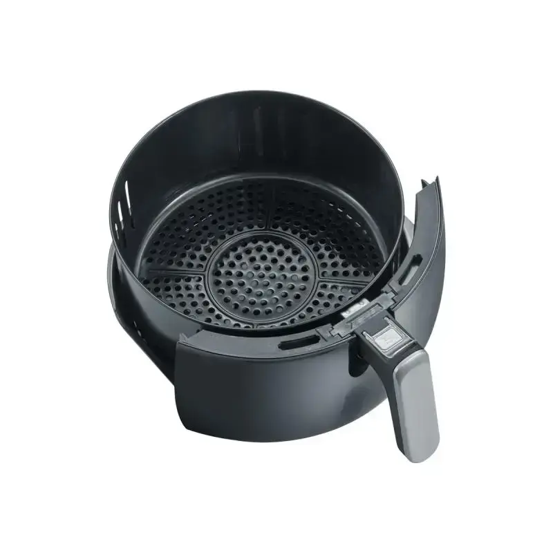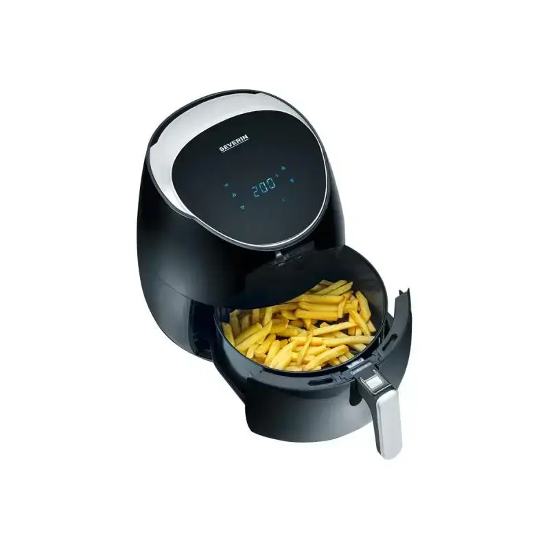 Praktische Fritteuse ohne Fett mit großem XXL-Frittierkorb, der ca. 5-Liter-Fassungsvermögen hat. Ideal für eine vielseitige, gesunde und schnelle Zubereitung, bei der Sie ohne weitere Zugaben von Öl oder Fett auskommen. Durch die intuitive Touch-Bedienung können Sie eines von 8 Automatik-Programmen wählen und Pommes, Fleisch, Gemüse sowie viele andere Speisen bei einer Temperatur von 80°C bis 200°C zubereiten. Für eine hohe Kratzfestigkeit und beste Antihaftwirkung sorgt eine keramische Beschichtung an Frittierkorb und Korbträger der Fritteuse ohne Fett.