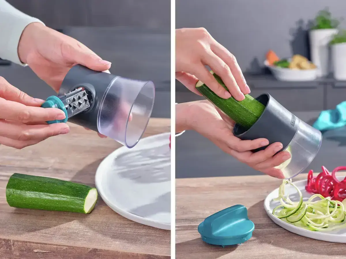 With this LEIFHEIT cutter you can easily make your own vegetable spaghetti or tagliatelle from zucchini, carrots or other suitable vegetables. The spiral cutter has three different blades for different types of vegetable.