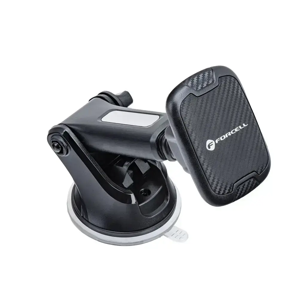 A strong suction cup with a sticky gel ensures a stable fit on flat surfaces such as the windshield or dashboard.