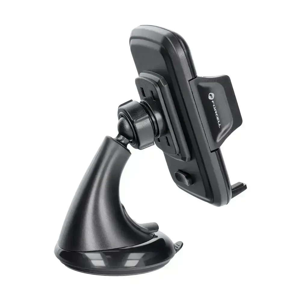 The handle is attached with a suction cup, which additionally has a locking clip. You can mount it to the windshield or the smooth surface of the dashboard. Silicone tabs protects against slipping out. The clamp release button makes it easy to remove the phone from the holder.