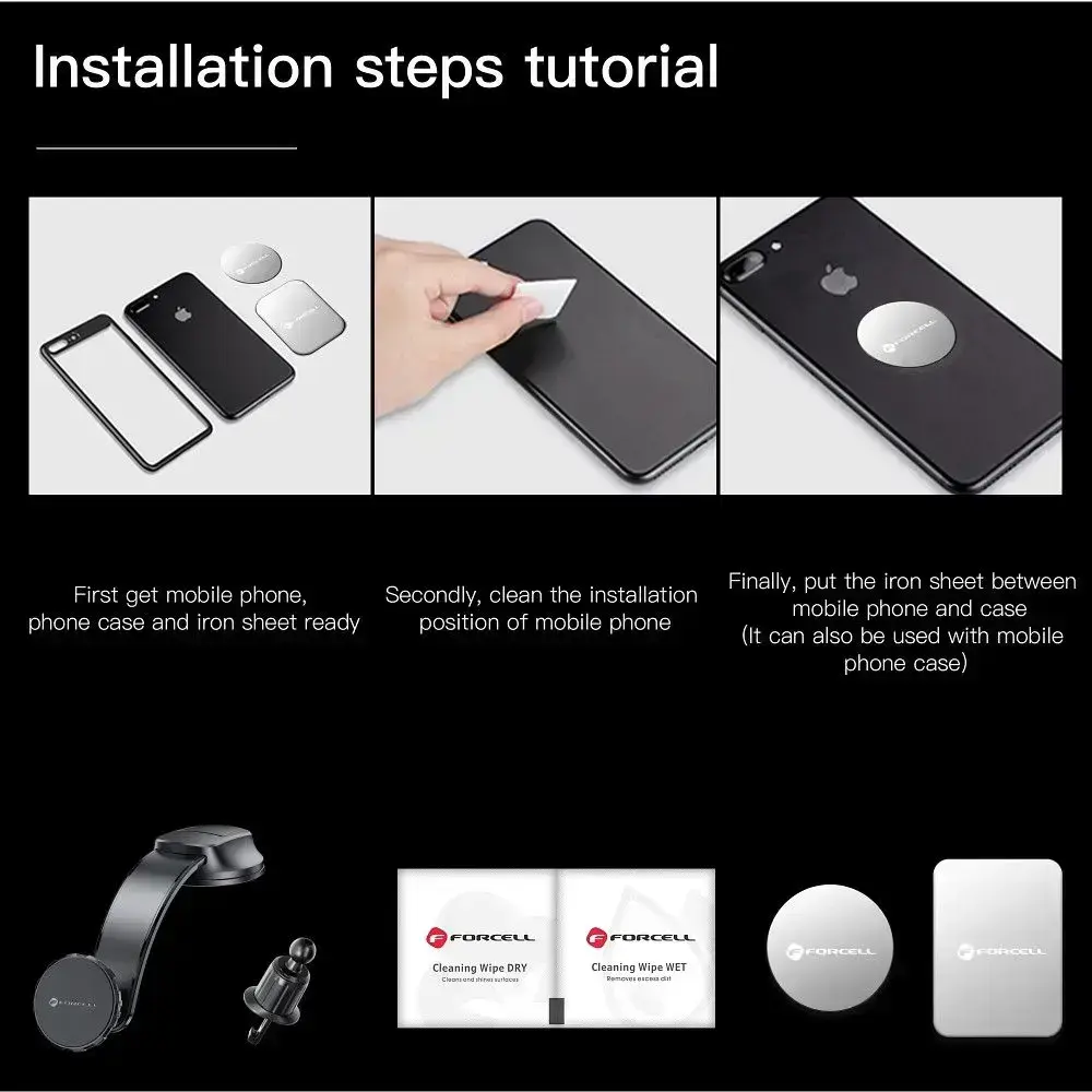 Equipped with strong magnets, the Forcell car holder keeps your smartphone stable even during dynamic driving. Two metal plates are included with the product to enable magnetic mounting of the phone.