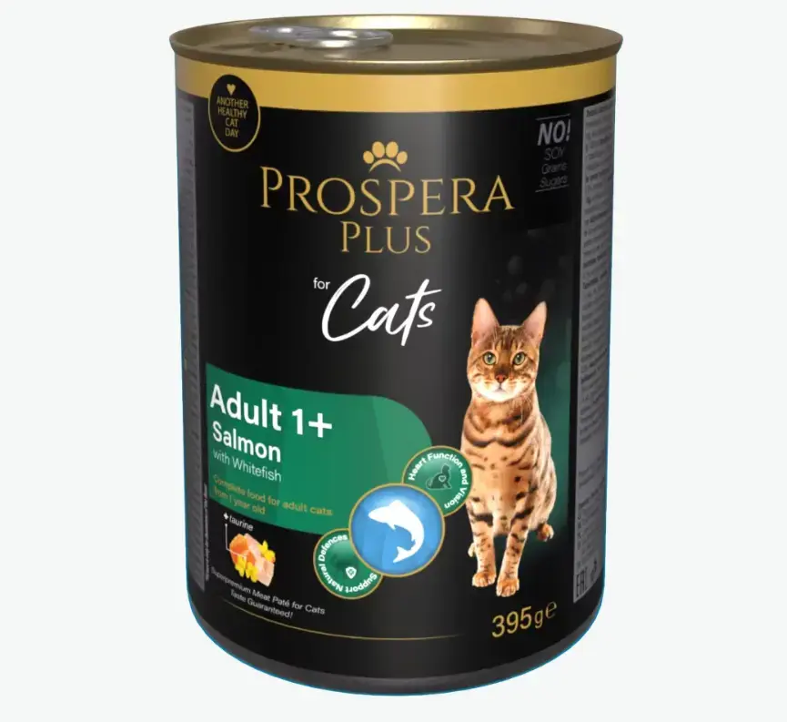 Konservi kaķiem – Prospera Plus Cat Meat Paté Adult 1+, Salmon with Whitefish, 395 g