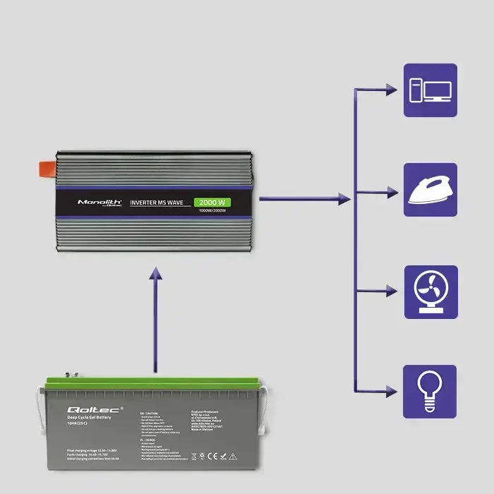 The Monolith voltage converter by Qoltec MS wave is a device that changes the DC voltage of 12V to AC voltage of 230V. It is ideal where there is no direct access to the power grid. It will easily power equipment such as a laptop, computer, games console, kettle or hairdryer or charge your smartphone. The product has built-in mains sockets compatible with European plugs and a USB port.
