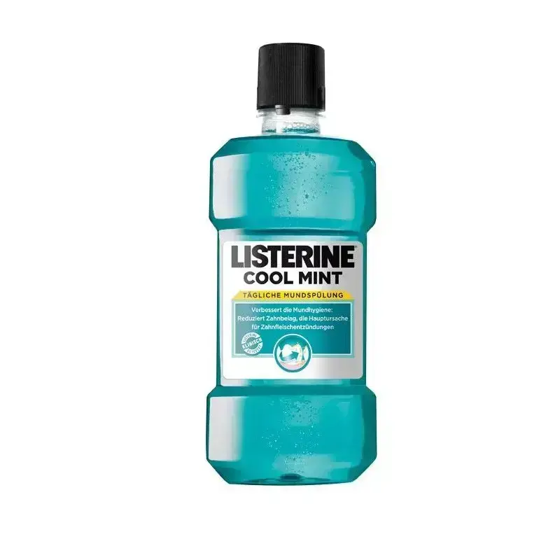 Listerine Coolmint mouthwash 500ml. Brushing only cleans 60% of the surfaces of your teeth leaving plaque bacteria to grow in the hard to reach places in your mouth. Used twice a day Listerine Coolmint is proven to: 1. Kills up to 97% of germs left behind after brushing. 2. Reduce plaque by up to 56% more than brushing alone. 3. Provide fresh breath protection for up to 24 hours. 4. Maintains healthy gums by killing germs above and below the gum line to keep gums healthy.