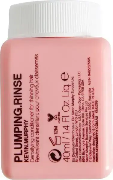 Kevin Murphy Plumping Rinse Conditioner, 40 ml, Hair Conditioners for Women, During hair washing, shampoo opens the external hair structure - the cuticle. That's why it's important to give your hair a treatment after washing to reseal the cuticle. And that's exactly what the conditioner from Kevin MurphyPlumping RinseConditioner takes care of. In addition to closing the hair fibre, it ensures its nourishment, hydration and softness, without which beautiful, shiny and healthy hair cannot do without. It will protect the hair from mechanical damage and dryness, as well as smooth the surface and help soften it, which will make it easier to detangle and further styling. Characteristics: provides the necessary hydration improves the structure of the hair gives hair elasticity and volume ensures brilliant shine Ingredients: no sulphates How to use: Apply after first washing with shampoo. Leave to act for a while, then rinse thoroughly.