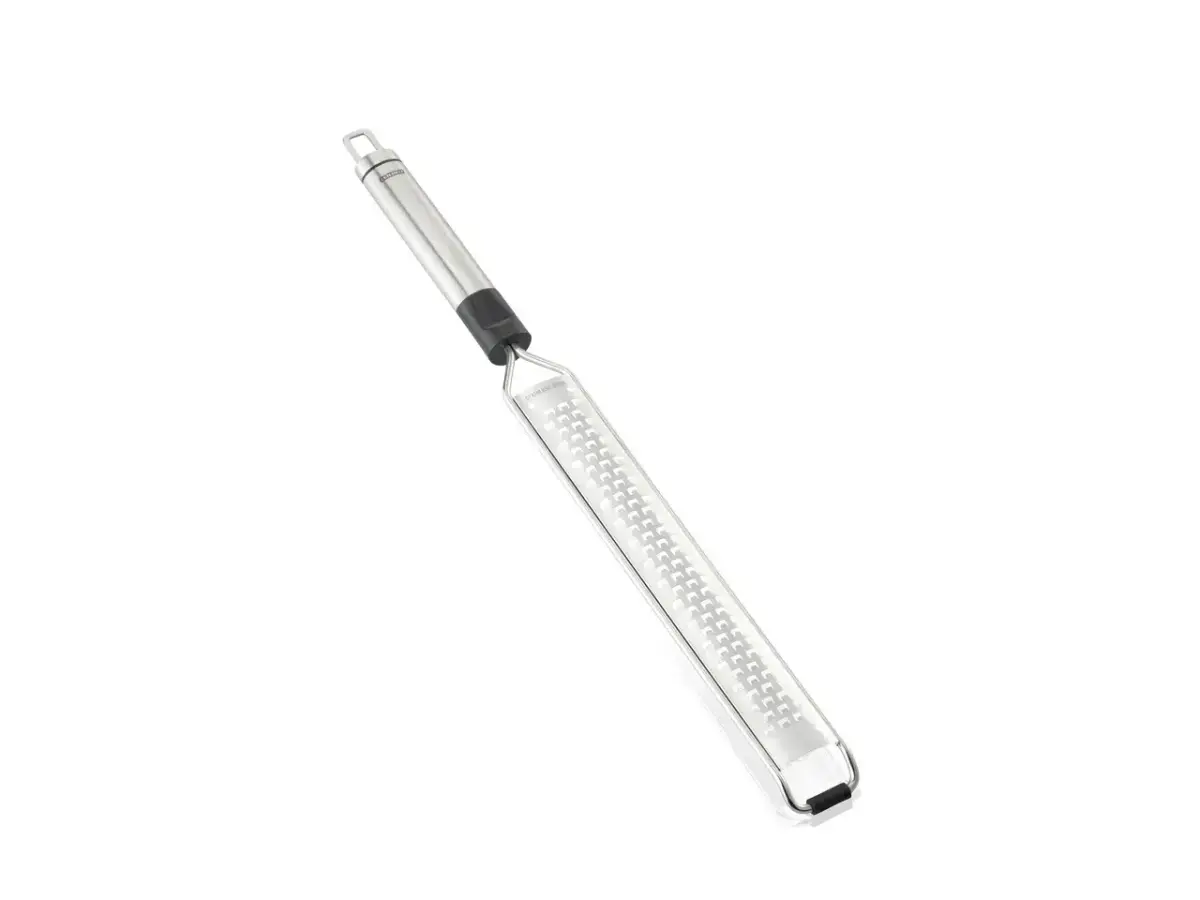 Вкус остается прежним и полностью раскрывается во время еды, а не во время нарезки. В комплект входит защитный кожух для безопасного хранения терки. Длинная узкая ручка обеспечивает особенно удобное управление. Можно использовать в посудомоечной машине.