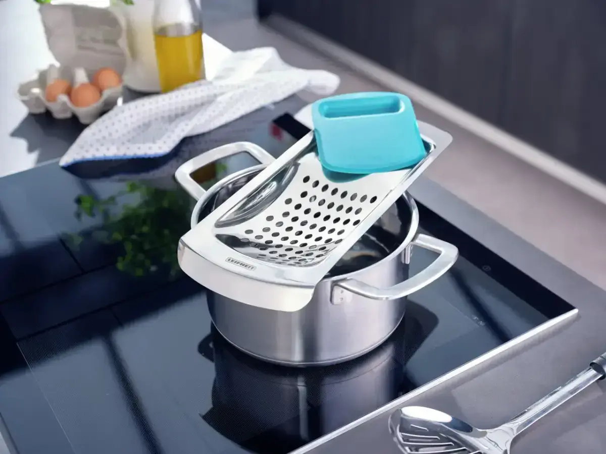 Устройство можно свободно разместить на краях кастрюли, а с помощью гибкого пластикового скребка легко и удобно приготовить клецки.