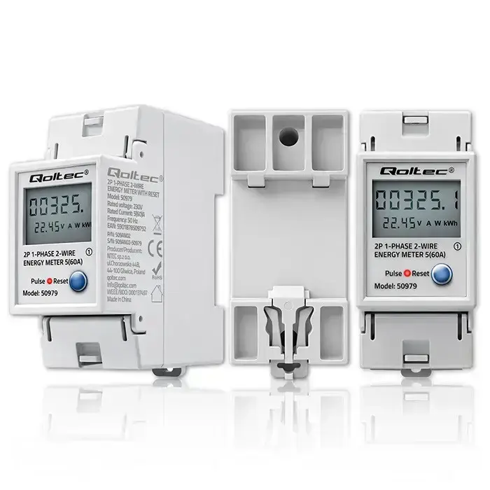 Qoltec Single-phase electronic energy consumption meter for DIN rail | RESET | periodic and continuous meter | 230V | 60A | LCD | LED | 2P