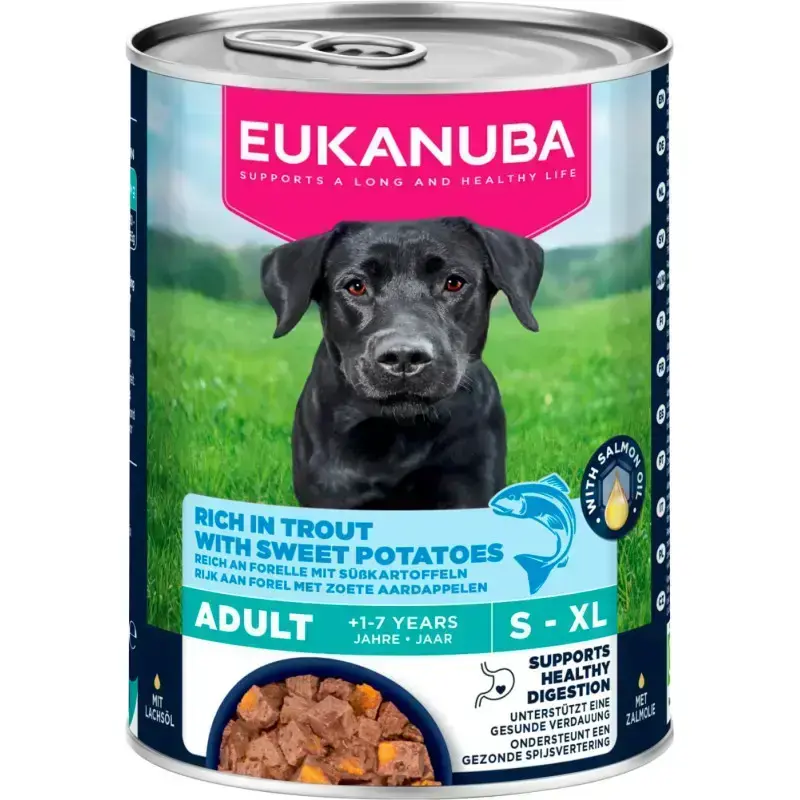 Konservi suņiem - EUKANUBA wet food for adult dogs, rich in trout with sweet potatoes 400 g