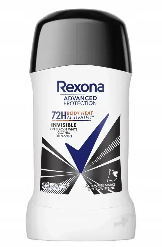 Rexona Advanced Protection Invisible Black&White antyperspirant w sztyfcie 50ml Rexona Advanced Protection Invisible Black&White antyperspirant w sztyfcie oferuje 72-godzinną nieprzerwaną ochronę przed potem i nieprzyjemnym zapachem nie pozostawiając śladów na jasnych i ciemnych ubraniach. Niezawodna technologia Body Heat Activated, aktywuje się gdy rośnie temperatura twojego ciała. Tworzy jeszcze mocniejszą barierę, która chroni Cię przed przykrym zapachem i potem. Gdy robi się gorąco, nic nie zapewni Ci lepszej ochrony niż Rexona Advanced Protection. Niezależnie od tego, czy codziennie idziesz pobiegać, intensywnie trenujesz w domy czy na siłowni bądź po prostu spotykasz się z przyjaciółmi, antyperspirant Rexona Advanced Protection Invisible Black&White da Ci wsparcie, którego potrzebujesz. Kiedy ty ciężko pracujesz, Rexona pracuje jeszcze ciężej. Możesz na nią liczyć. Ten antyperspirant zapewni Tobie świeży, kobiecy, kwiatowo-owocowy zapach w każdy dzień roku, niezależnie od tego, jak bardzo jesteś aktywna. Dzięki niemu zyskasz świeżość przez cały dzień oraz 72-godzinną nieprzerwaną ochronę, która współgra z temperaturą Twojego ciała, dając Ci nieustającą pewność siebie od rana do wieczora. Możesz nosić to, co lubisz. Ruszaj się kiedy chcesz. Wiesz, że masz zaawansowaną kontrolę nad świeżością.