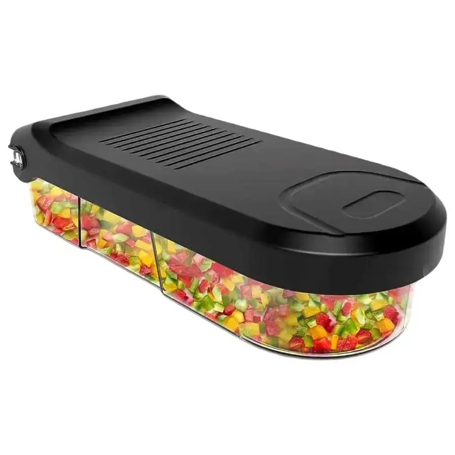 Griezējs dārzeņiem un augļiem ir praktisks virtuves palīgs, kas ļauj ātri sagriezt produktus vienāda izmēra kubiņos salātiem, zupām un piedevām. Ierīce aprīkota ar maināmiem griešanas režģiem dažādu kubiņu izmēru iegūšanai, tāpēc tā ir piemērota gan kartupeļiem un burkāniem, gan sīpoliem, paprikai un citiem dārzeņiem vai augļiem. Vienkārši novietojiet produktu uz griešanas režģa ar plakano pusi uz leju un stingri aizveriet vāku, lai asie asmeņi vienā kustībā to sagrieztu gabaliņos, kas uzreiz iekrīt ietilpīgajā savākšanas traukā. Komplektā iekļauts arī režģa tīrītājs, kas palīdz viegli atbrīvot pie asmeņiem pielipušos produktus un uzturēt griezēju tīru. Trauka ietilpība 1.2 l.