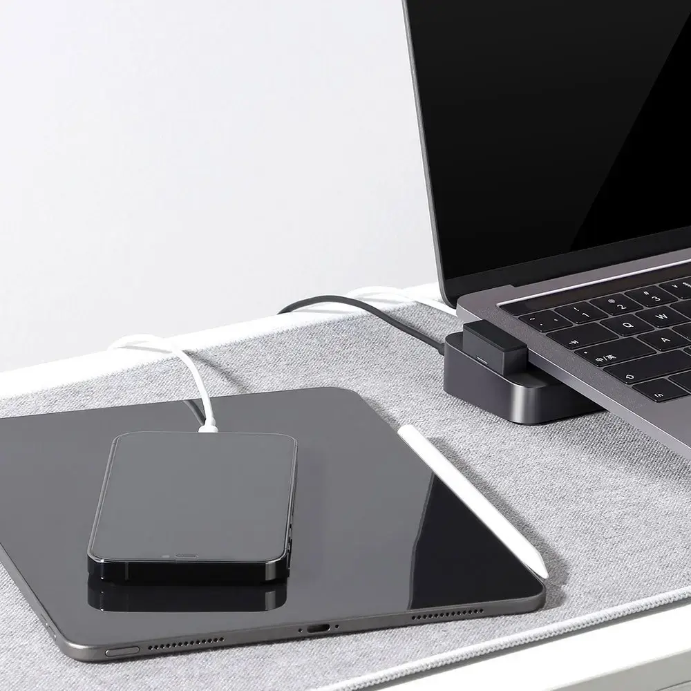 The HUB on one side and the stand on the other. A device designed specifically for Apple MacBook Pro to improve air circulation and, as a result, prevent the computer from overheating. • HUB is a stand that facilitates heat dissipation. Raising the back of the laptop on the stand prevents the device from heating up excessively. It is also a better position at work and less strain on the spine. • The HUB has 8 ports to which you can connect, for example, a keyboard, mouse, hard drive, network cable or HDMI cable. • Support for Thunderbolt 3 technology allows you to charge the computer's battery, data transfer up to 40 Gbps and image transfer. • It takes about 1.5 hours to fully charge the MacBook Pro. You can quickly and safely charge the battery in your computer. • Flawless 5K resolution images. • The adapter is travel-sized and fits anywhere. • Non-slip silicone pads. They prevent the device from slipping.