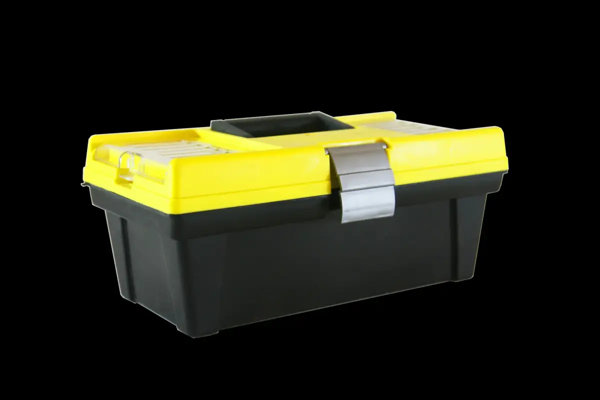Ящик для инструментов Stuff 12 Carbo. Ящик оснащен удобной ручкой, полипропиленовыми защелками, глубоким лотком, практичными боковыми ручками и двумя органайзерами для мелких предметов. Размеры ящика составляют 312 x 167 x 130 мм.