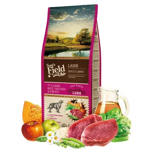 Сухой корм для собак - Sam´s Field DOG Fresh Lamb & Rice ADULT LARGE 13 кг. Профилактическая формула. Полноценный сухой корм супер премиум класса с ягненком и овощами для взрослых собак крупных пород с 30 месяцев. Содержит.5%), глюкозамин (0.023%), хондроитин сульфат (0.018%), фруктоолигосахариды (0.018%), маннан-олигосахариды (0.013%), Юкка Мохаве (0.Аналогичные компоненты.3%, Омега-3 жирные кислоты 0.3%, Омега-6 жирные кислоты 1.9%, лизин 1.0%, метионин 0.3%, треонин 0.85%, триптофан 0.32%, аргинин 1.3%.Добавки: пищевые добавки на 1 кг: витамины. A 18.000 МЕ/МЕ, вит. D3 1.400 МЕ/МЕ, вит. E (альфатокоферол) 450 мг, вит. C 220 мг, вит. B1 5,0 мг, вит. B2 6,0 мг, вит. B6 5,0 мг, вит. B12 0,05 мг, ниацинамид 25 мг, кальций-D-пантотенат 12,0 мг, биотин 0,65 мг, фолиевая кислота 0,65 мг, холин хлорид 1800 мг/кг. Микроэлементы: Cu (E4) 14 мг/кг, Zn (E6) 80 мг/кг, I (E2) 65 мг/кг, марганец 32 мг/кг, йод 0,6 мг/кг, селен (E8) 0,18 мг/кг. Не содержит красителей, консервантов, ГМО, сои. Производитель: Sam's Field, Чешская Республика