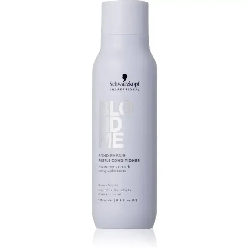 This conditioner neutralizes yellow tones and repairs hair bonds with almond oil and cornflower extract, providing intense conditioning and silky softness for maintained blonde clarity. | Schwarzkopf Blondme Bond Repair Purple Conditioner In Clear.