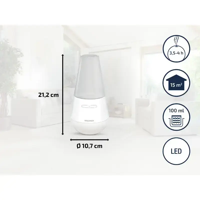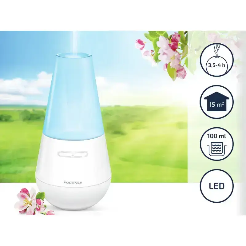 Современная технология ультразвукового распыления. Особенно подходит для ароматических масел. Время выхода аромата за одну заливку - около 3,5-4 часов. Установлен резервуар для воды емкостью 100мл. С голубой светодиодной подсветкой. SSC (Soehnle Safety Concept) гарантирует максимально безопасное использование продукта.