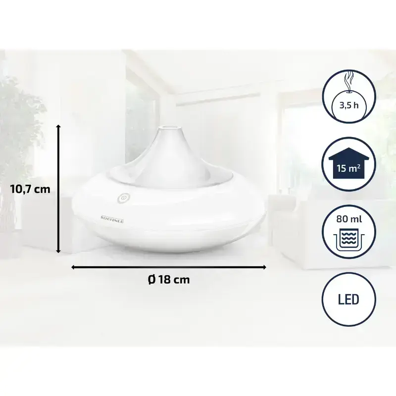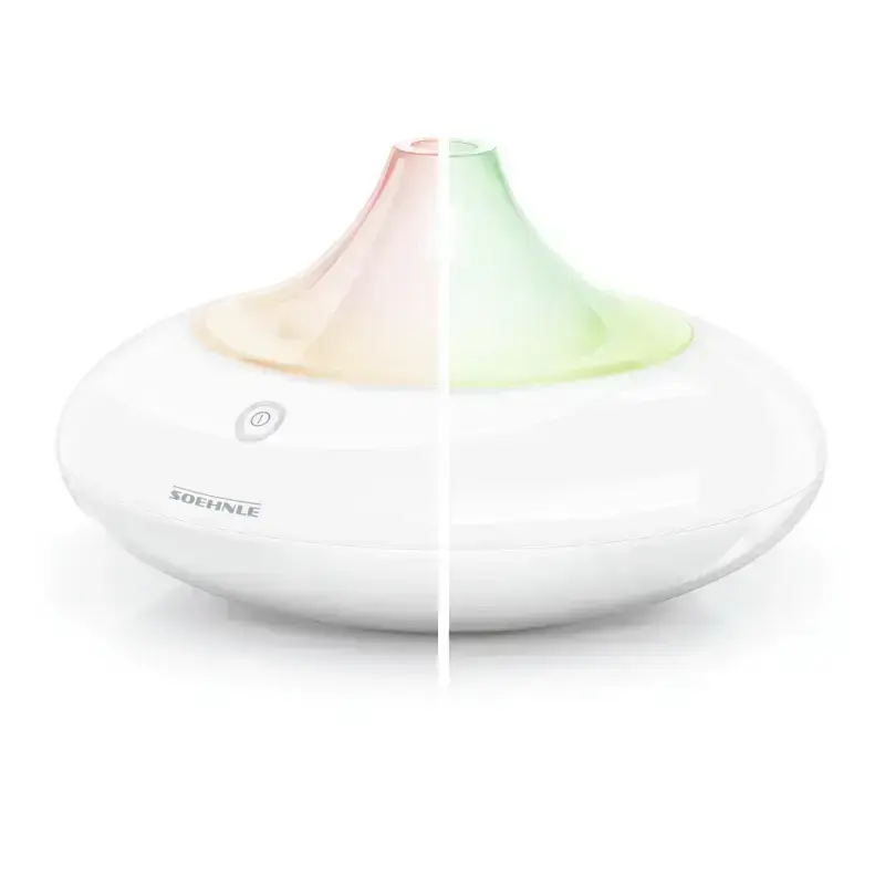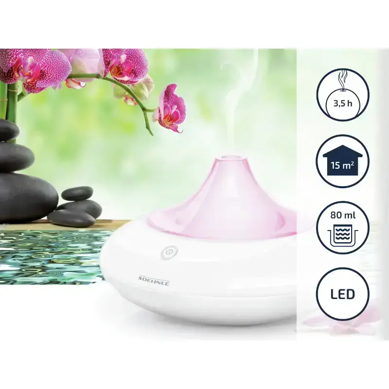 Элегантный освежитель воздуха превратит любую комнату в расслабляющий оазис духов, а меняющийся световые оттенки создадут романтическое настроение! Современная технология ультразвукового распыления. Особенно подходит для ароматических масел. С меняющийся (зеленая / красная / синяя / фиолетовая) LED подсветкой. После наполнения, аромат распыляется в течение примерно 3.5 часов. Установлена 80 миллиметровая емкость для воды. SSC (Концепция безопасности Soehnle), которая гарантирует максимально безопасного использования продукта.