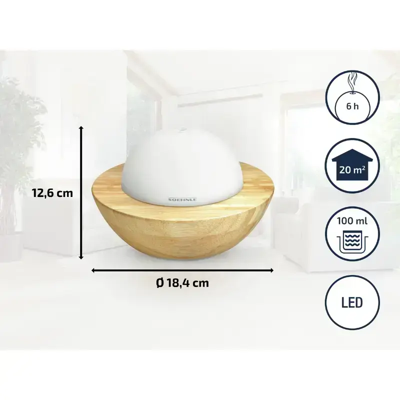 Автоматическая замена светодиодных цветных фонарей с возможностью остановки до определенного цвета. Время выхода аромата за одну заливку - до 6 часов. Установлен резервуар для воды емкостью 100мл. SSC (Soehnle Safety Concept) гарантирует максимально безопасное использование продукта.