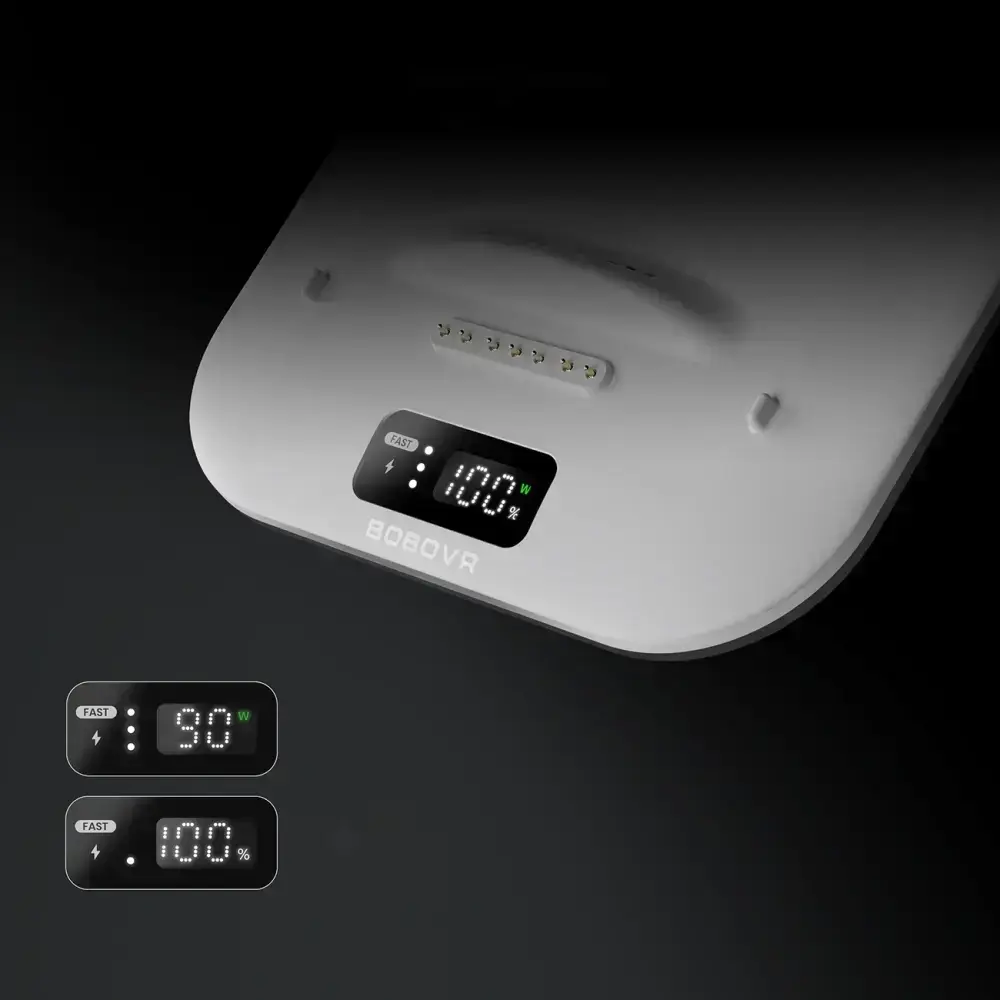 The BoboVR BD3 is a powerful docking station designed specifically for simultaneous charging of B100 batteries. It allows for simultaneous charging of up to three batteries at full power, without performance drops. Each slot operates independently, allowing you to quickly prepare a power reserve for long VR sessions. A clear display shows real-time charging parameters and the charge level of each battery. The compact design makes the station ideal for use on a desk or shelf.