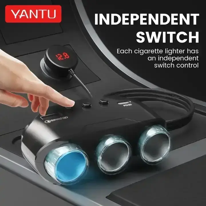 Car Cigarette Lighter Socket Splitter LM21 - 3 sockets + USB + Type C - QC 3.0 PD 3A 122W with display and cable