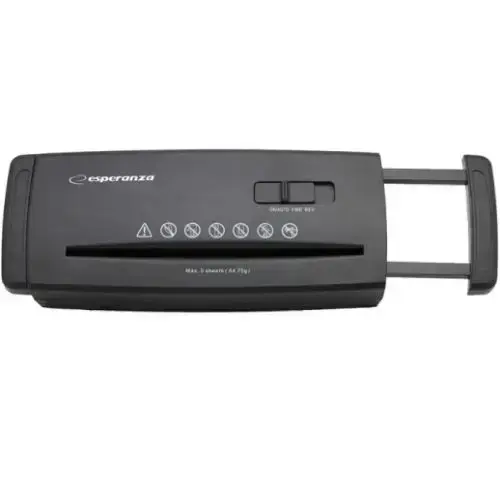 Papīra smalcinātājs, Esperanza BLADE. Efektīvi sasmalcina līdz 5 A4 formāta papīra loksnēm (80g) vienlaikus, kuru platums ir aptuveni 7 mm. Smalcinātājs ir aprīkots ar drošības slēdzeni un termoslēdzi.